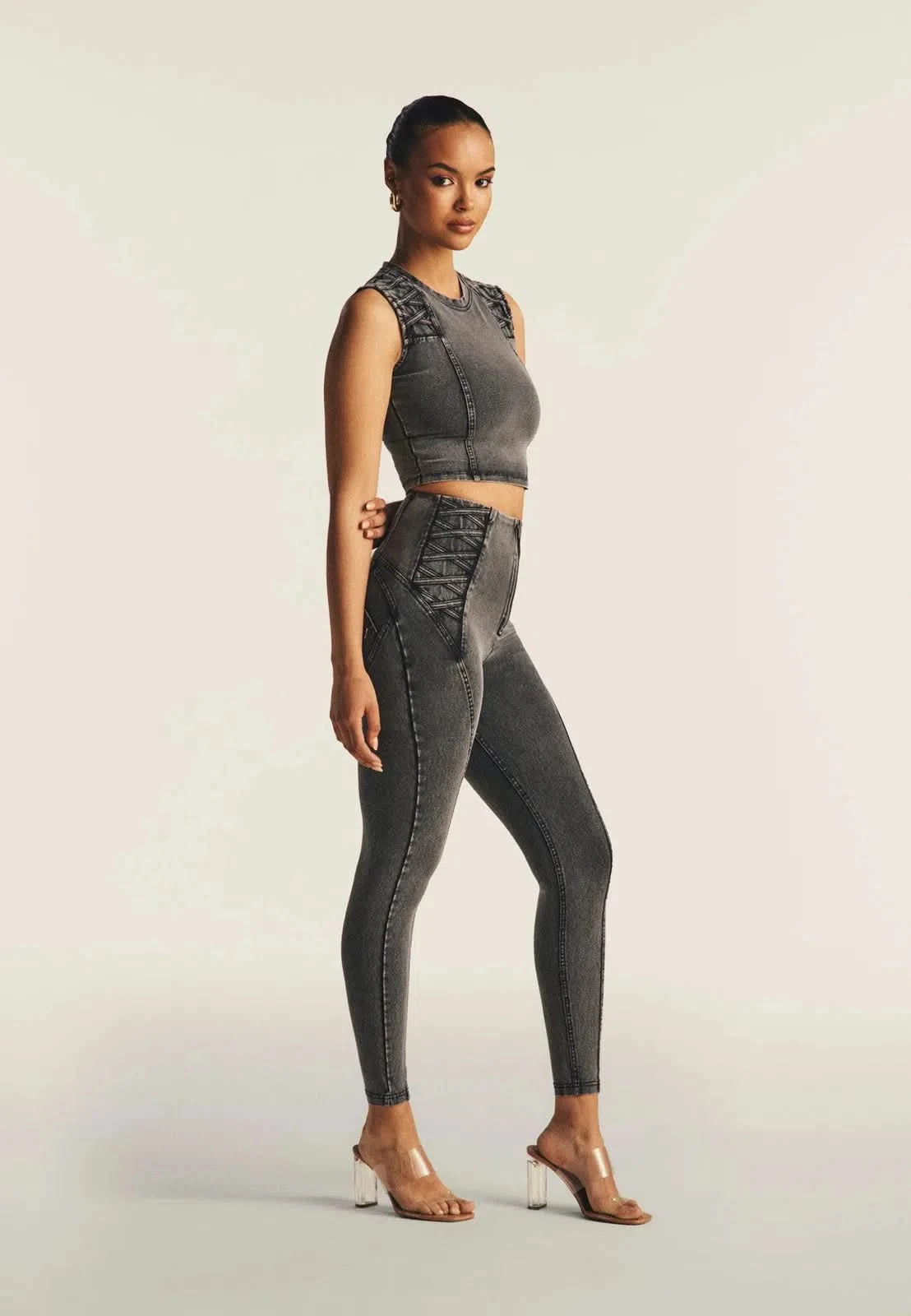 WRUP Denim Criss Cross Detail - High Waisted - 7/8 Length - Dark Grey Denim + Black Stitching