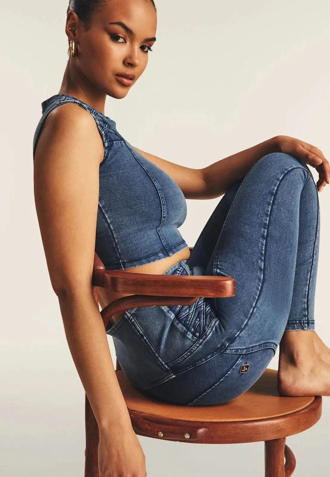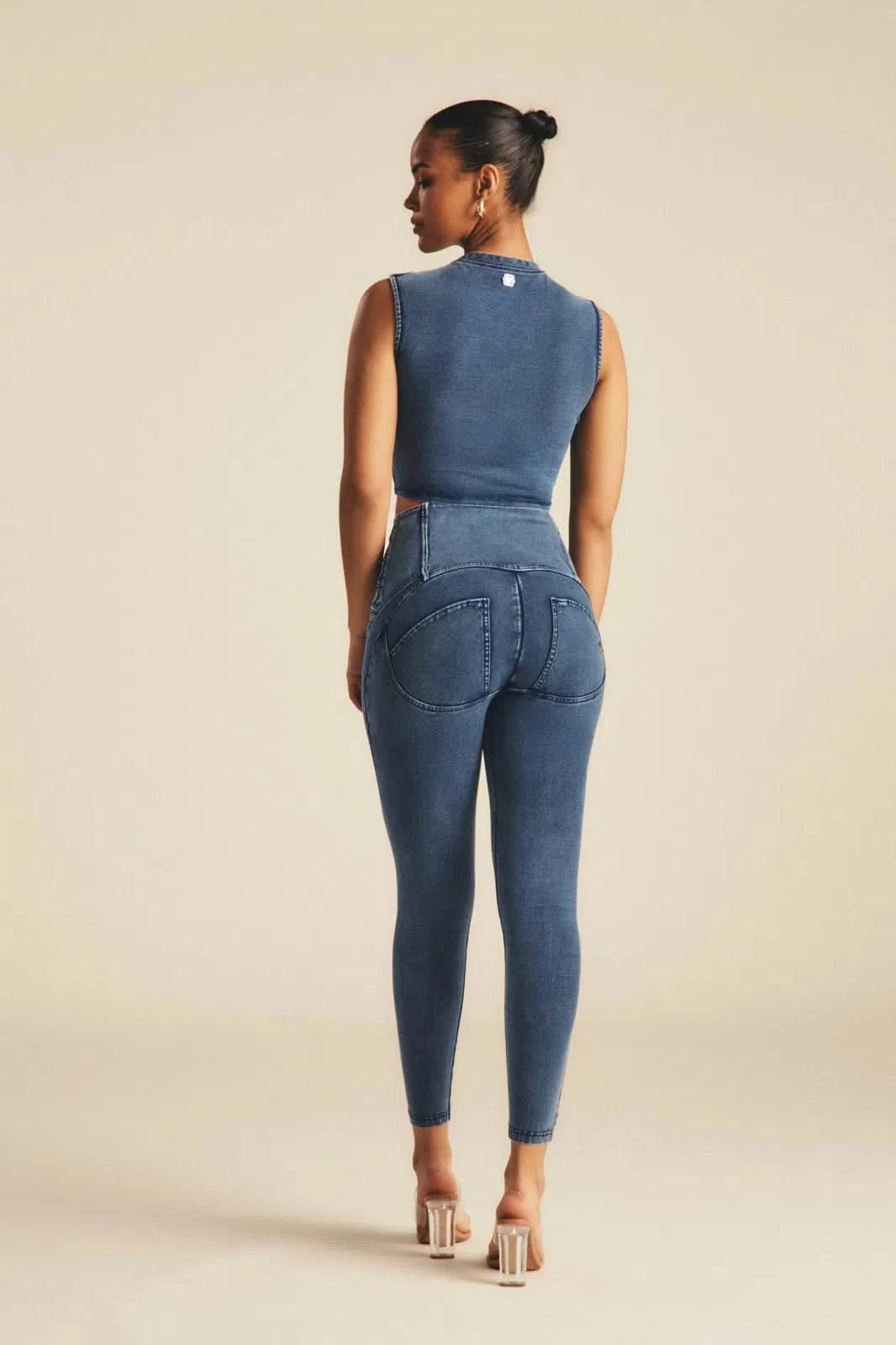 WRUP Denim Criss Cross Detail - High Waisted - 7/8 Length - Indigo Denim + Blue Stitching