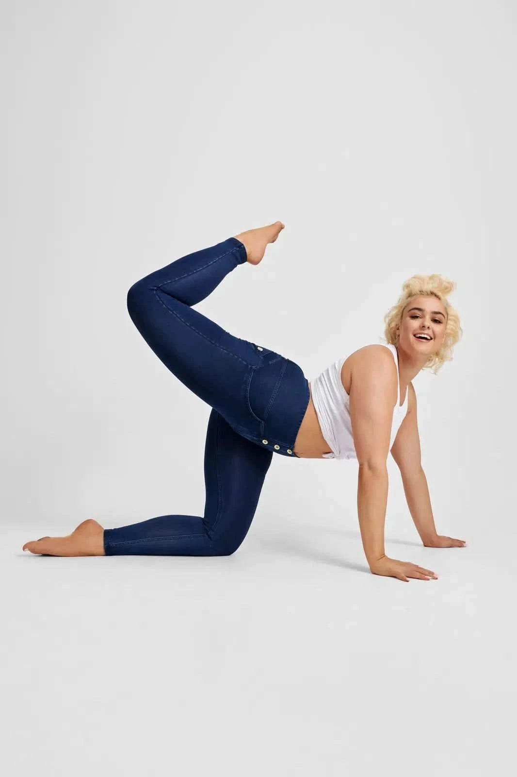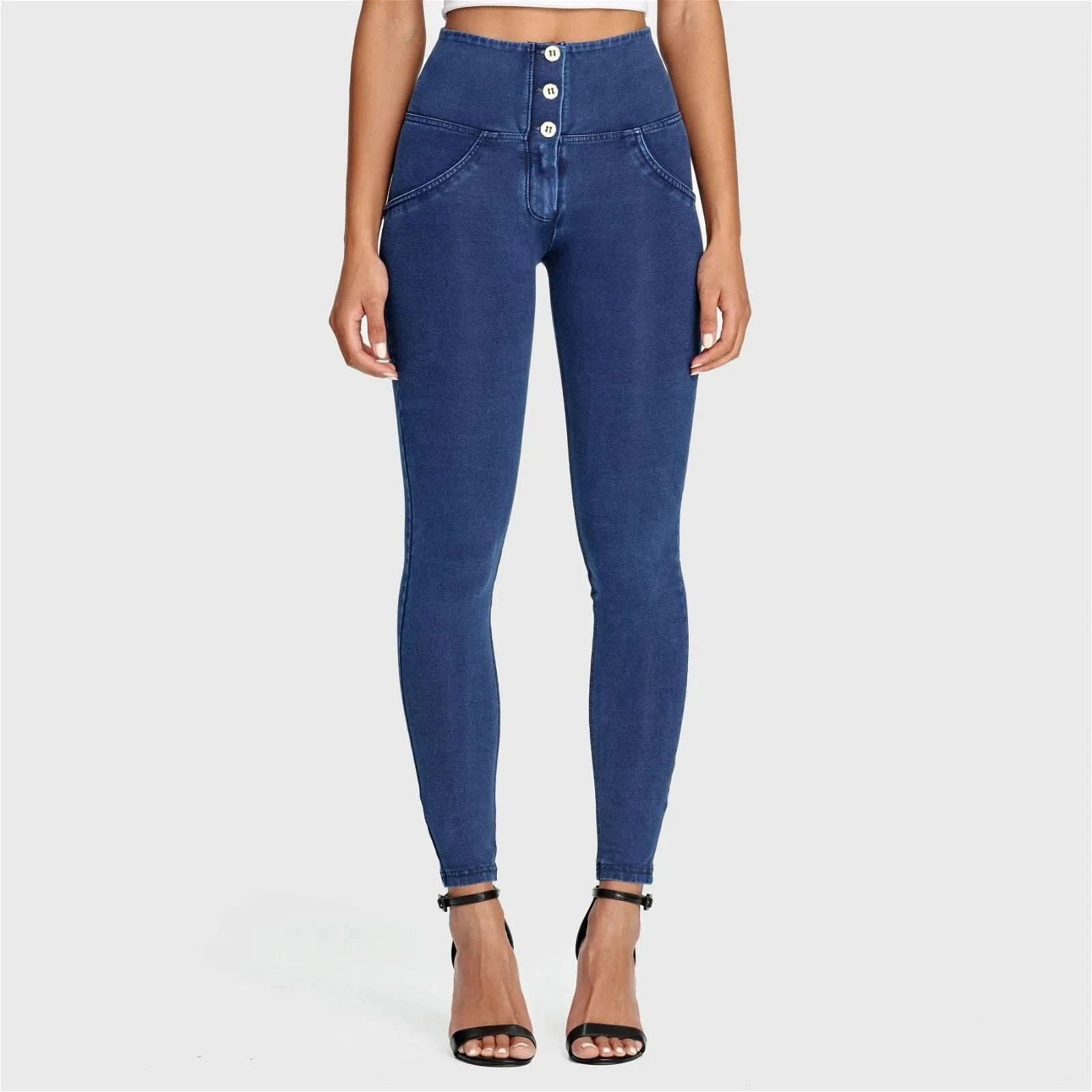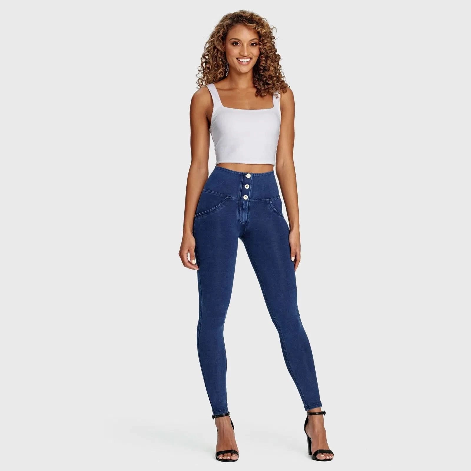 This high waist pant has been designed to reduce gaping around the waist band. The 3 functional buttons elongate the torso while the classic WRUP technology gives your behind that extra shaping you need or just want! A good class dark blue denim is what every wardrobe needs.