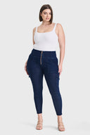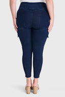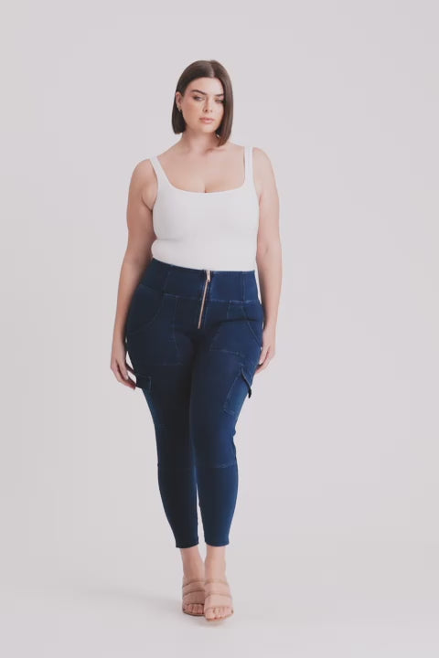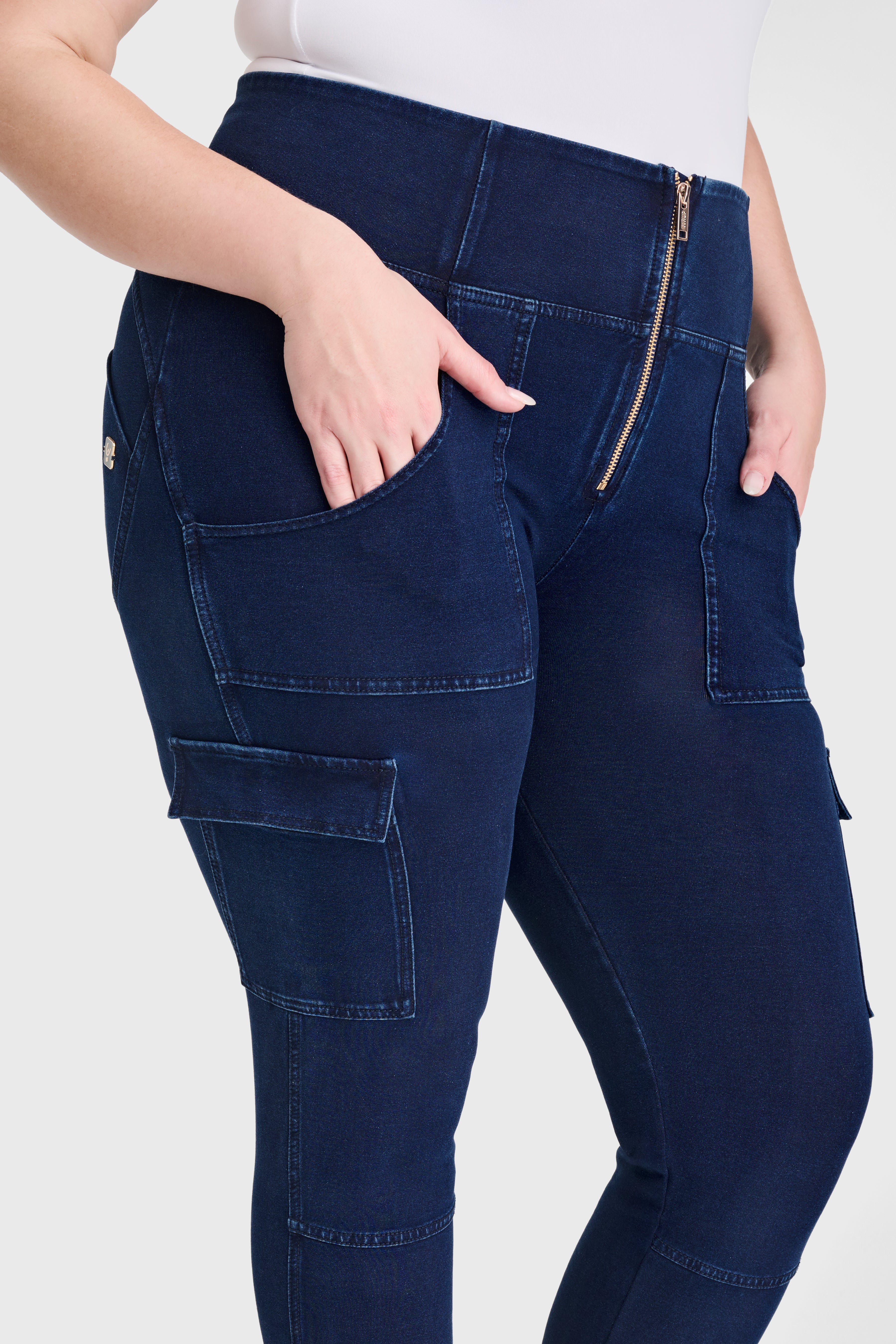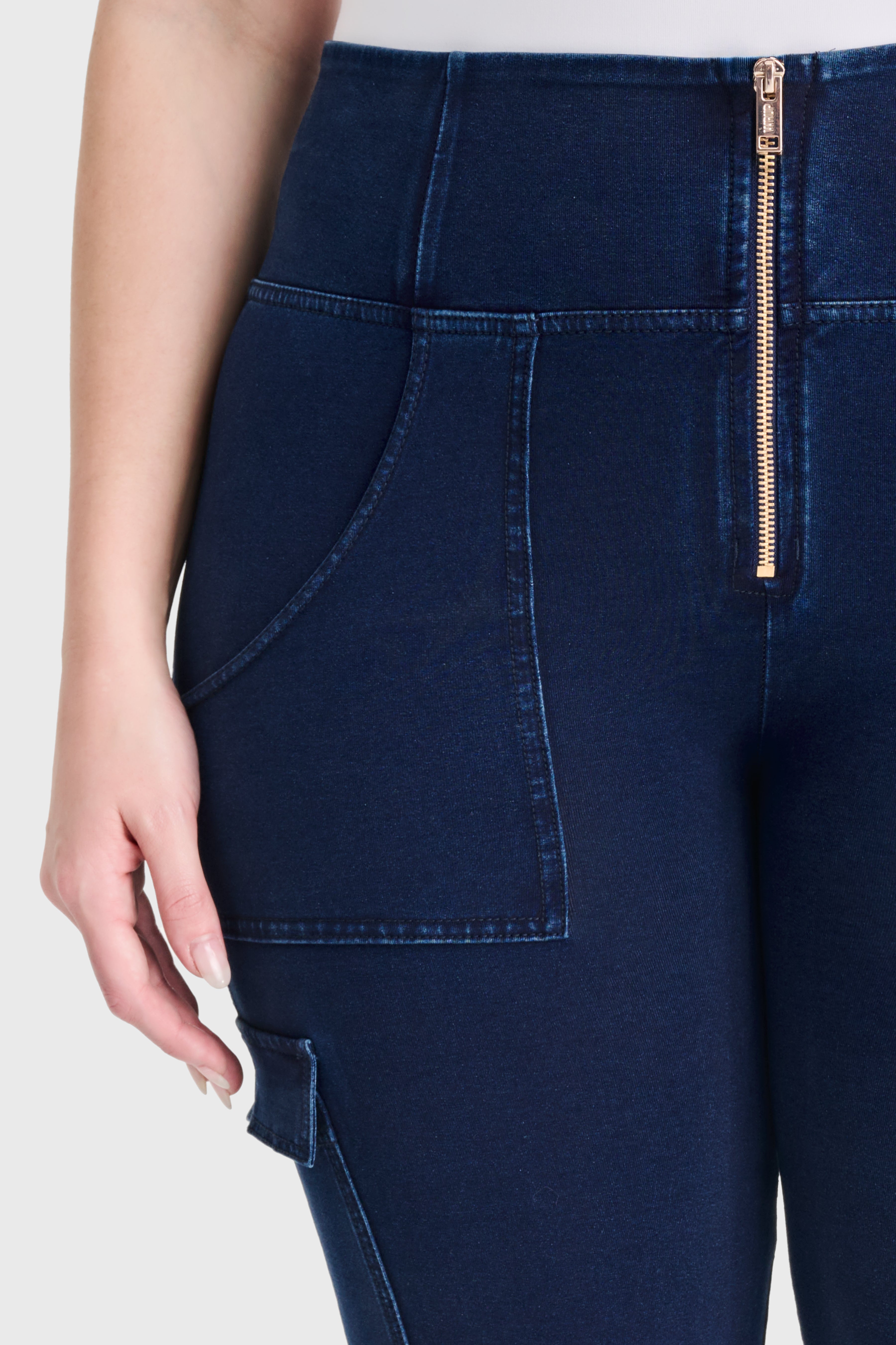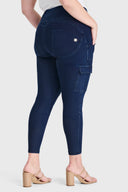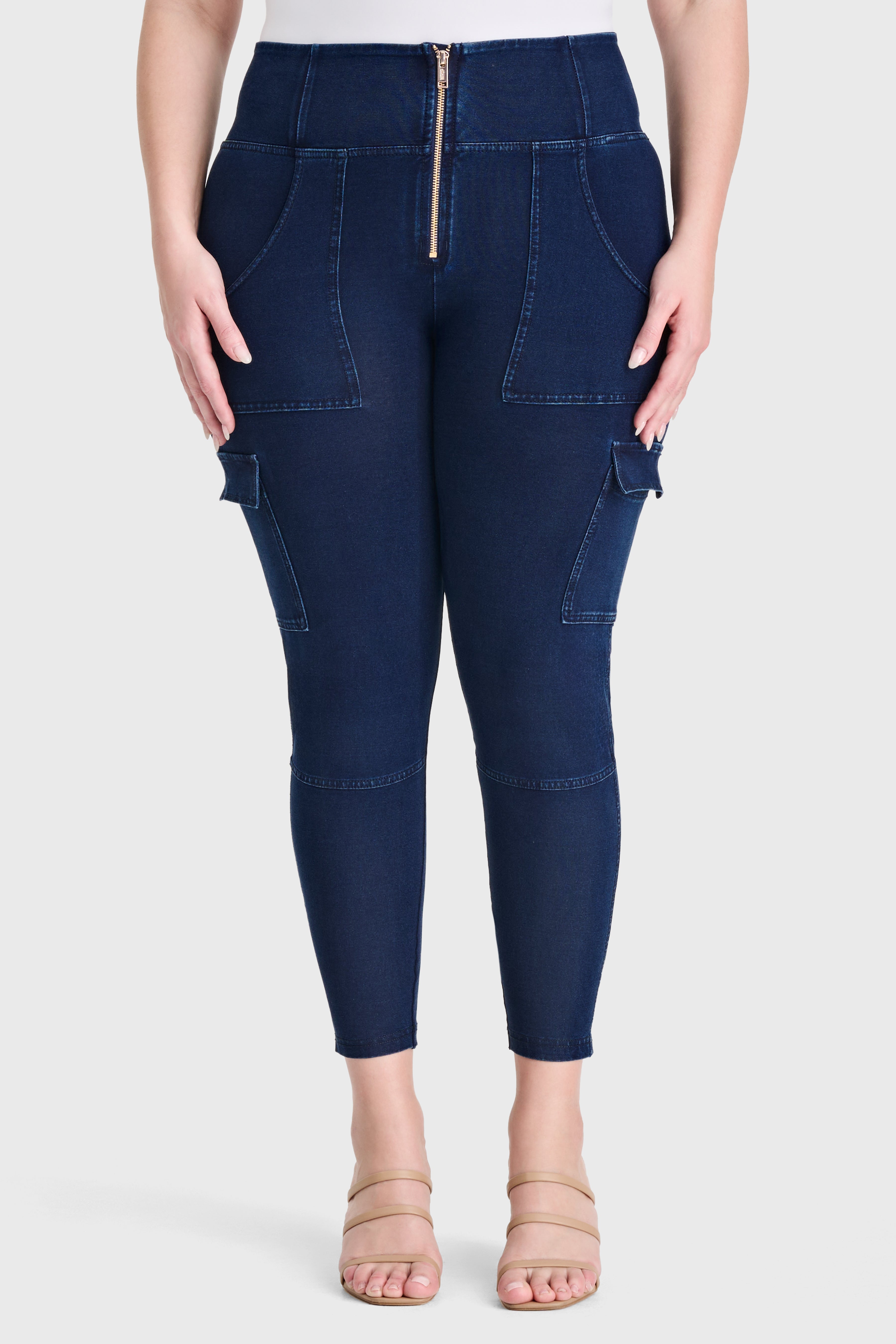 WRUP Cargo Denim - High Waisted - 7/8 Length - Dark Blue + Blue Stitching