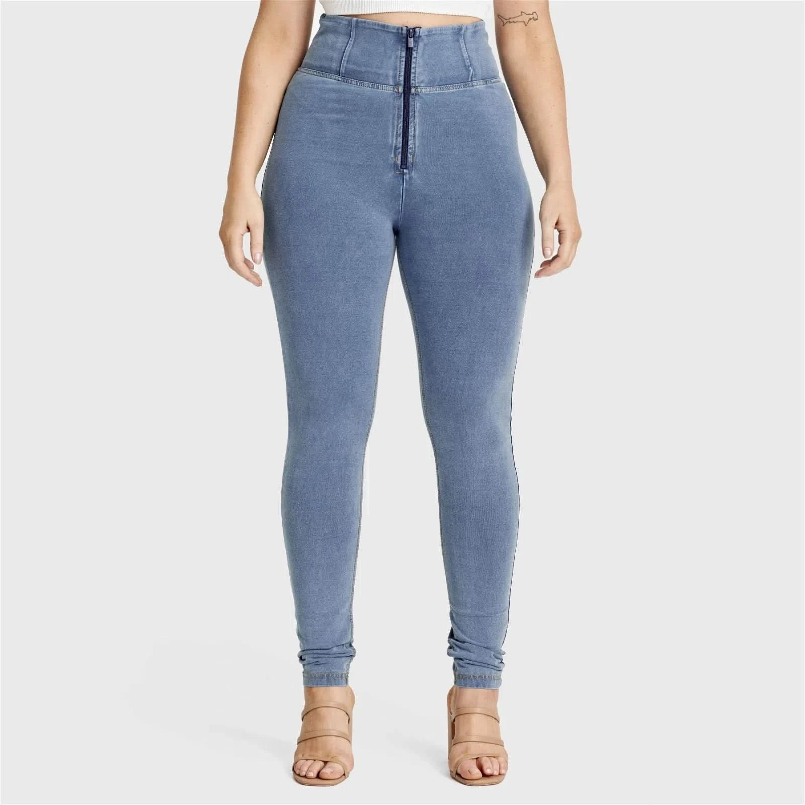 WRUP Curvy Denim - Zip High Waisted - Full Length - Light Blue + Yellow Stitching