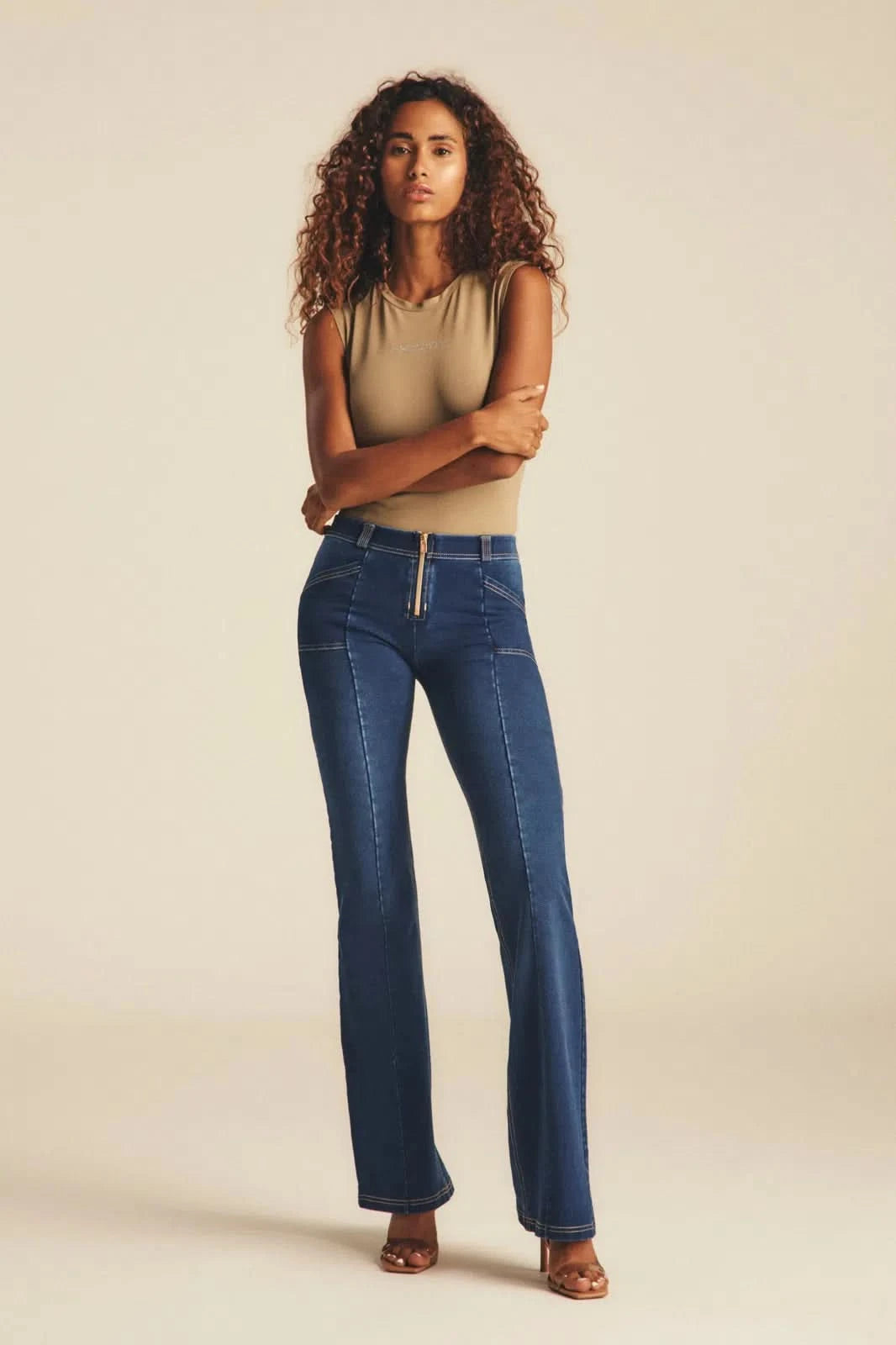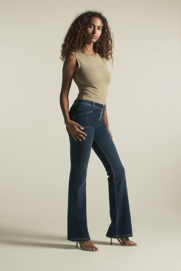 WRUP Denim with Gold Zip - Mid Rise - Flare - Dark Blue + Beige Stitching
