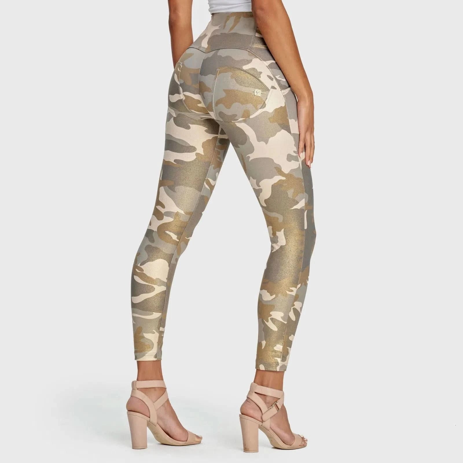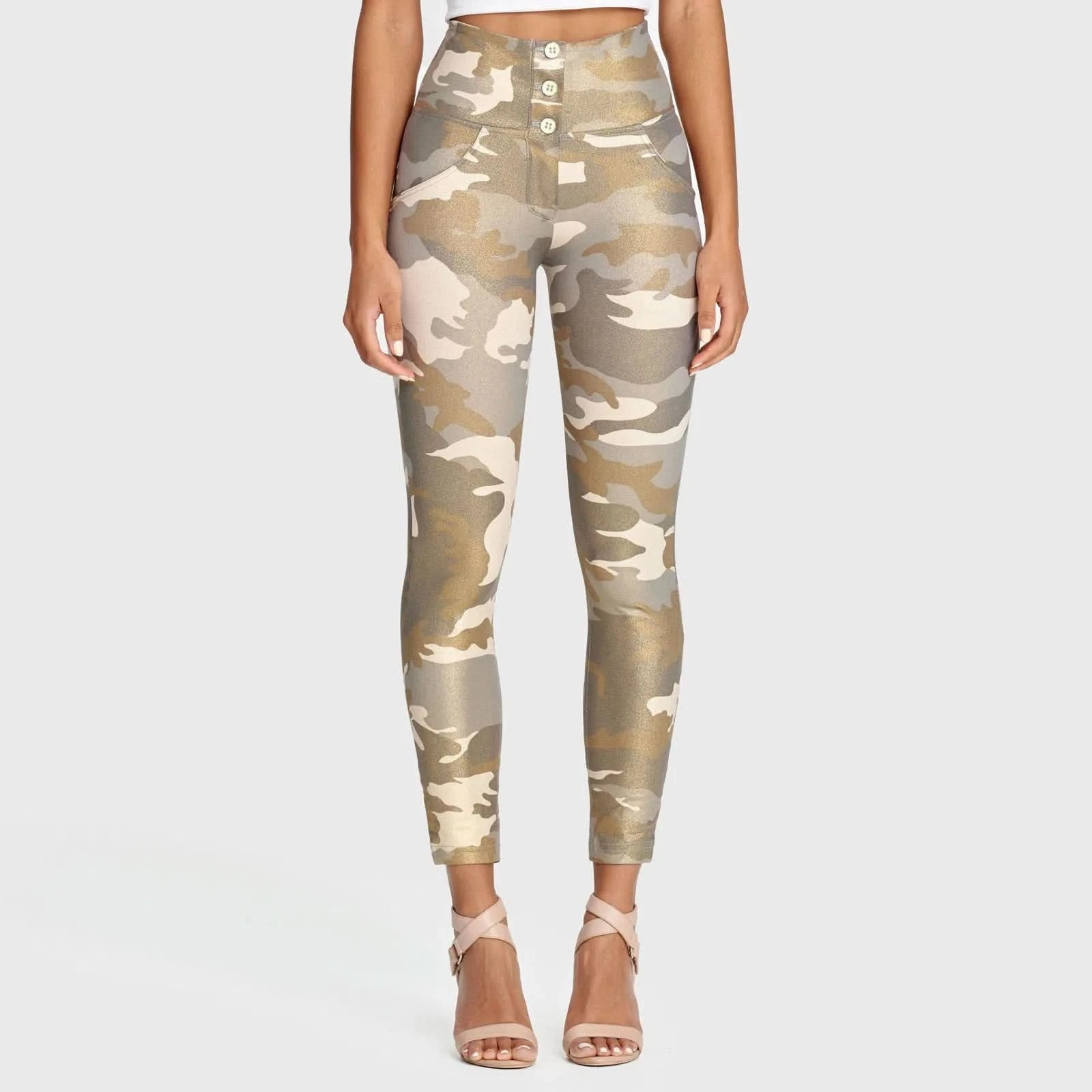 Discover the ultimate fusion of fashion, comfort, and flattering fit with our WRUP Fashion 3 Button - High Waisted - 7/8 Length - Glitter Gold Camo pants. Designed to make you shine, these pants combine our innovative WR.UP shapewear technology with a dazzling glitter gold camouflage pattern, ensuring you not only stand out from the crowd but do so with unparalleled comfort and style. Unlike traditional high-waisted pants, our unique blend of cotton and elastane provides a sculpting fit that accentuates and boosts your curves, offering both flexibility and a stay-put design for all-day confidence.