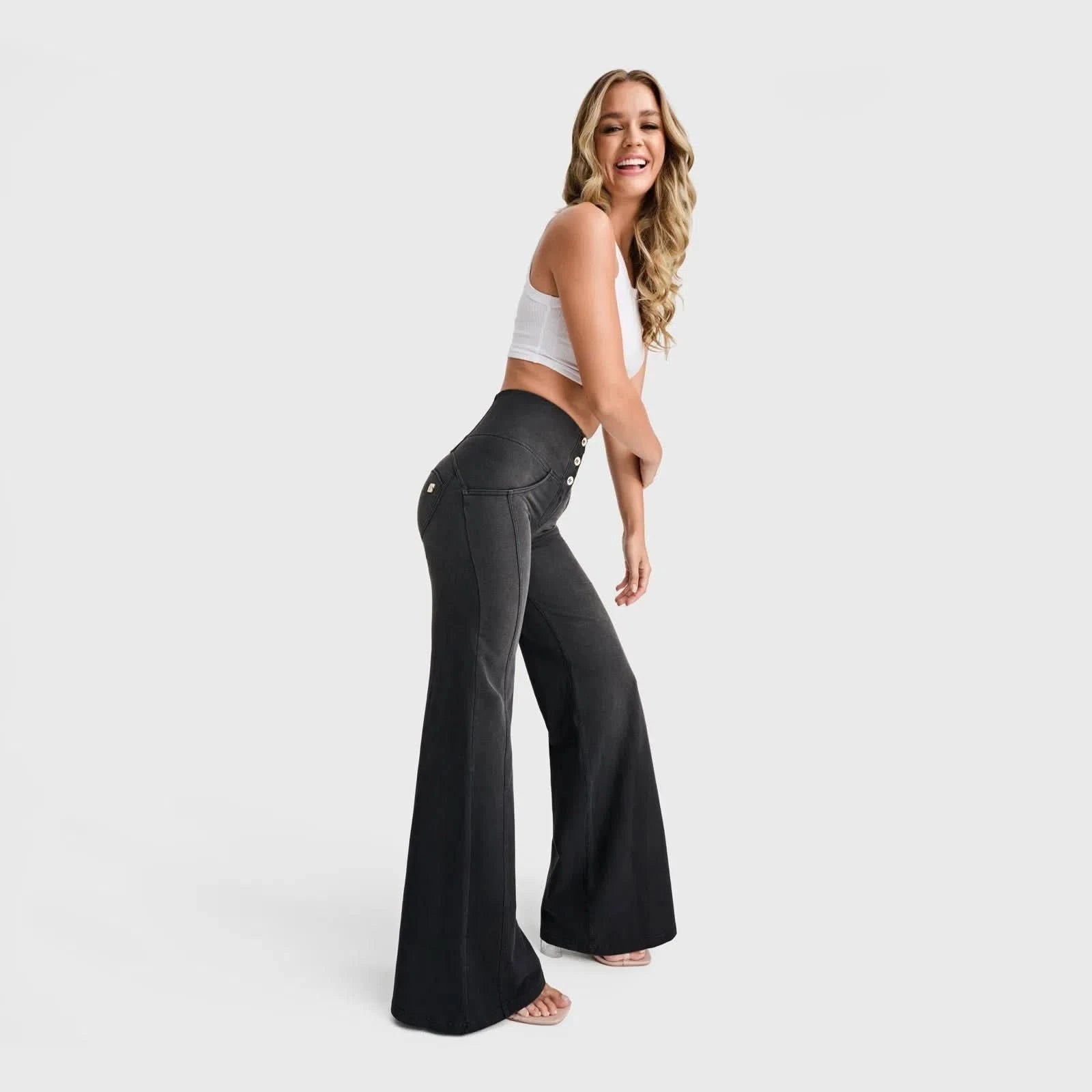 Elevate your style with the WRUP High Waisted Palazzo Flare. With a flattering 3 button high waist and elongating front line seam, these wide leg palazzo flares are perfect for a playful and fashion-forward look.