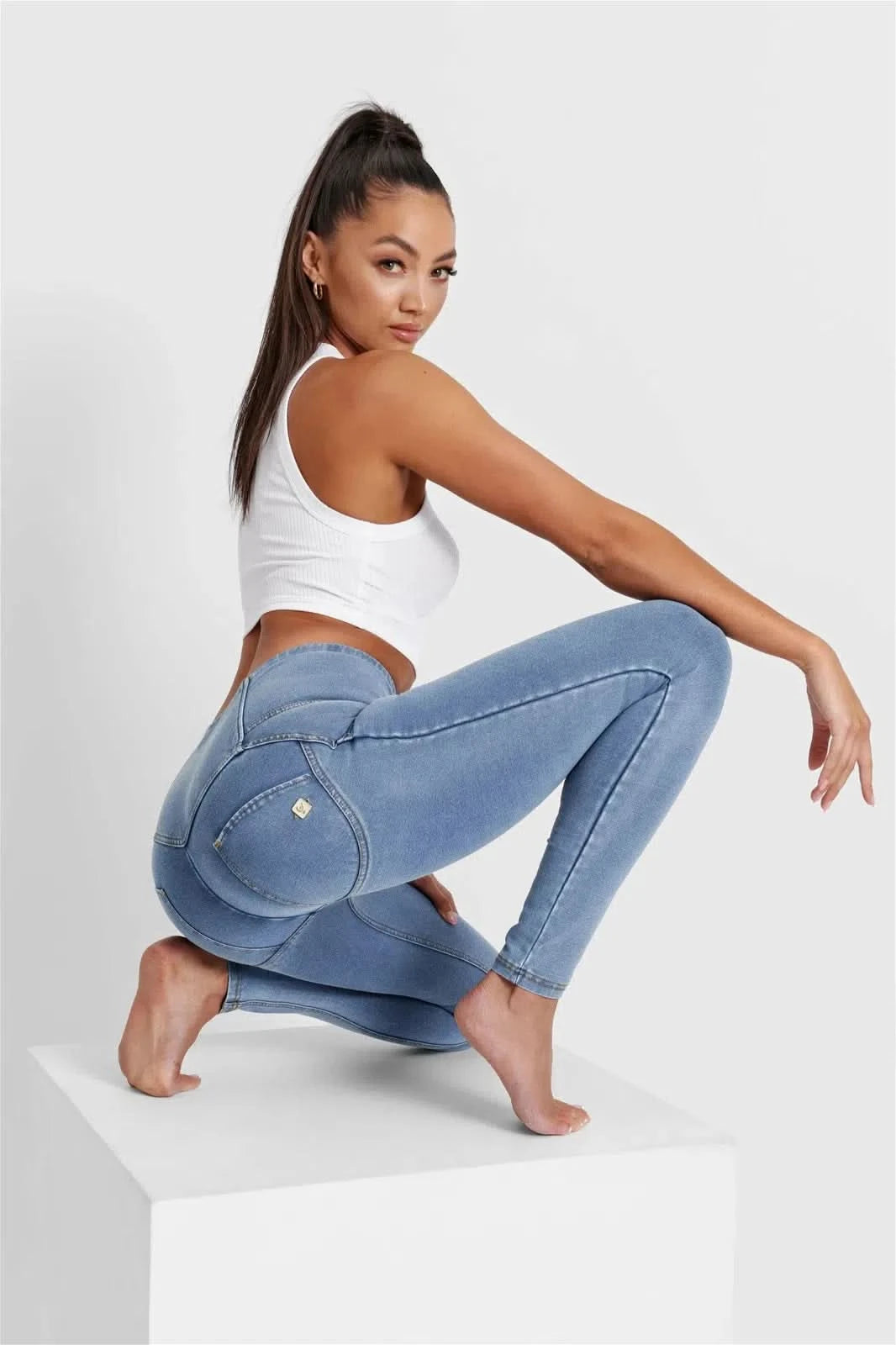 WRUP Denim - 3 Button High Waisted - Full Length - Light Blue + Yellow Stitching