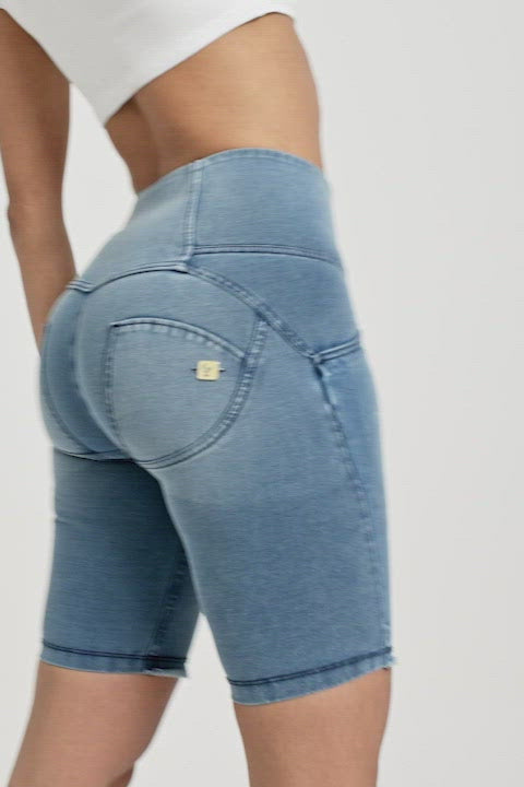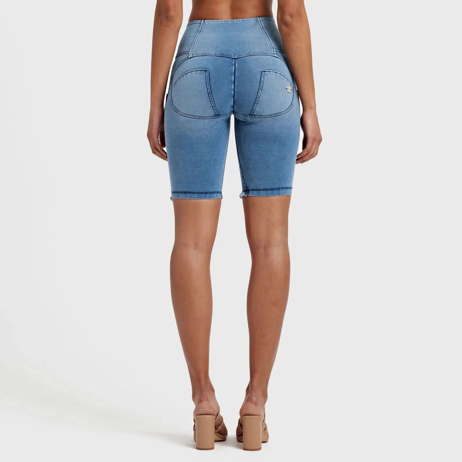 WRUP Denim - High Waisted - 3 Button Biker Shorts - Light Blue + Blue Stitching
