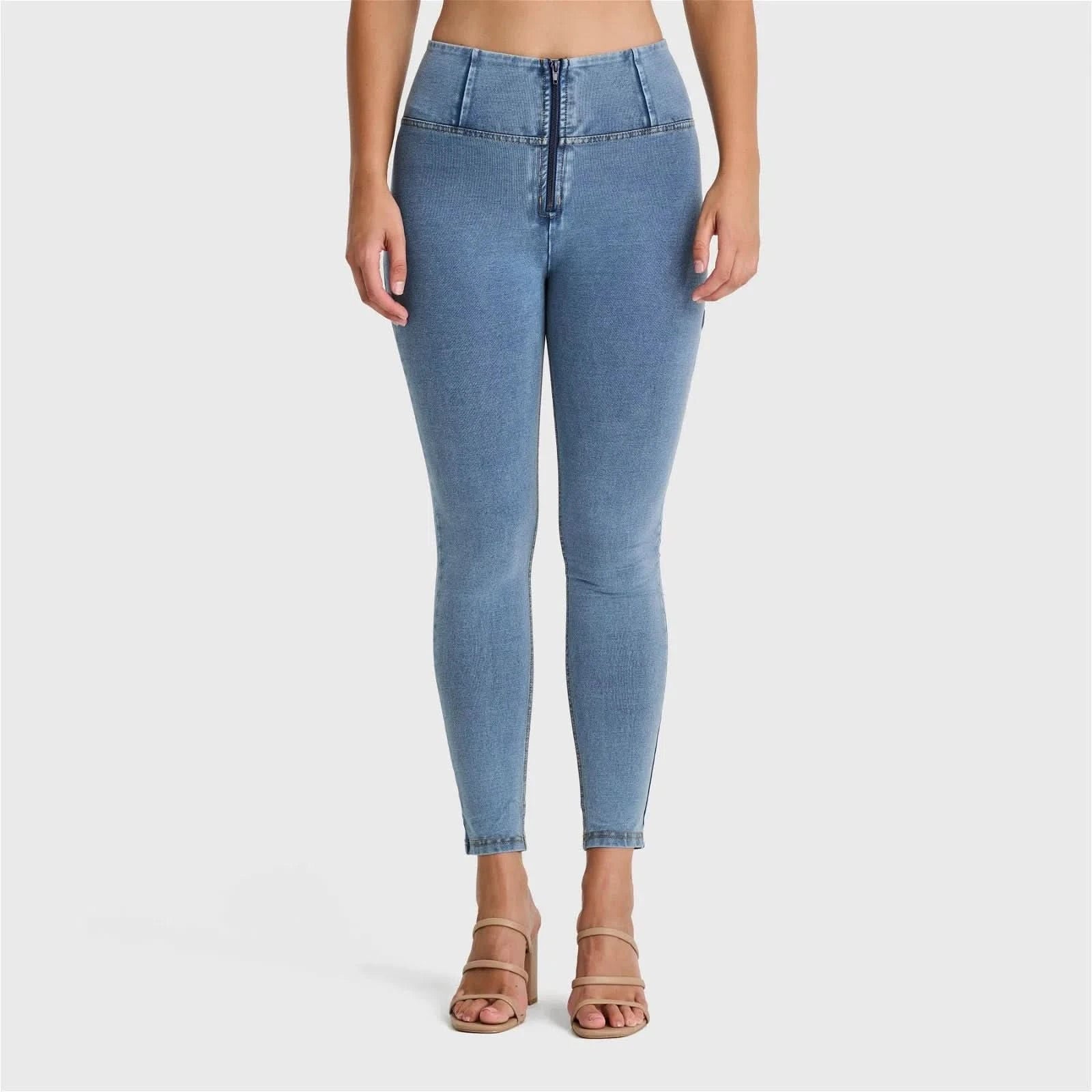 WRUP Denim - High Waisted - 7/8 Length - Light Blue + Yellow Stitching