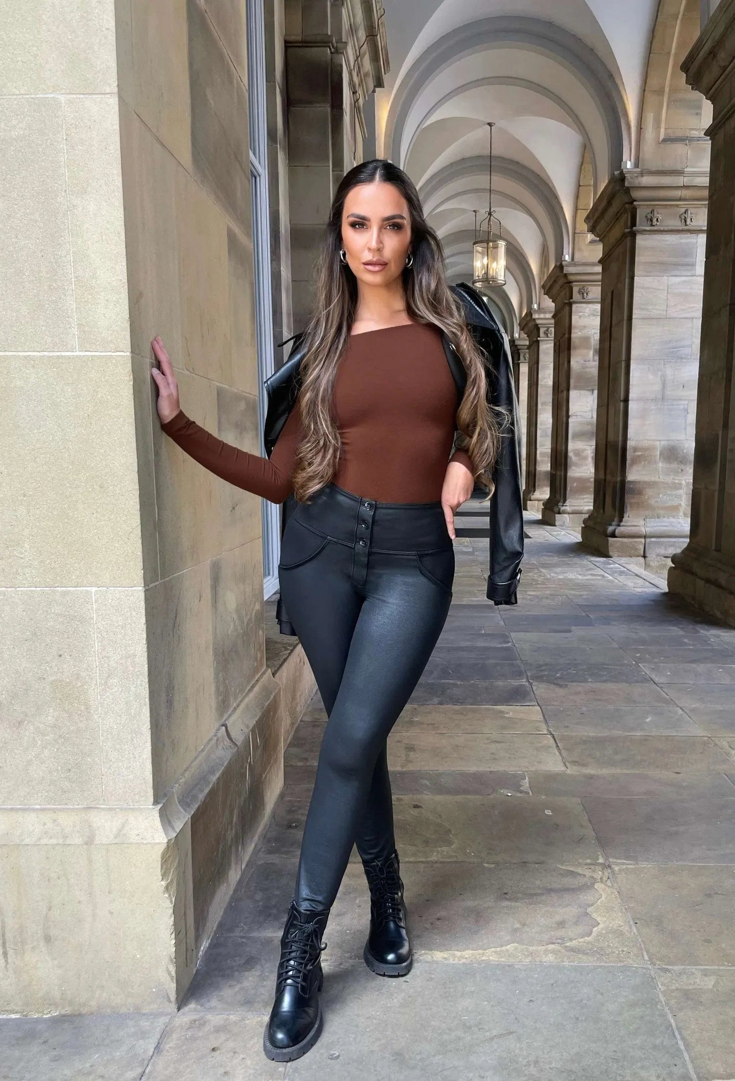 These Coated denim pants feature a smooth waxy finish on our jersey cotton fabric. Perfect for glamorous night out, they are a versatile black essential for any wardrobe. Freddy perfectly complements your curves. WRUP delivers unparalleled comfort and a flattering fit, making these pants ideal for happy hours, movie nights, and shopping adventures.