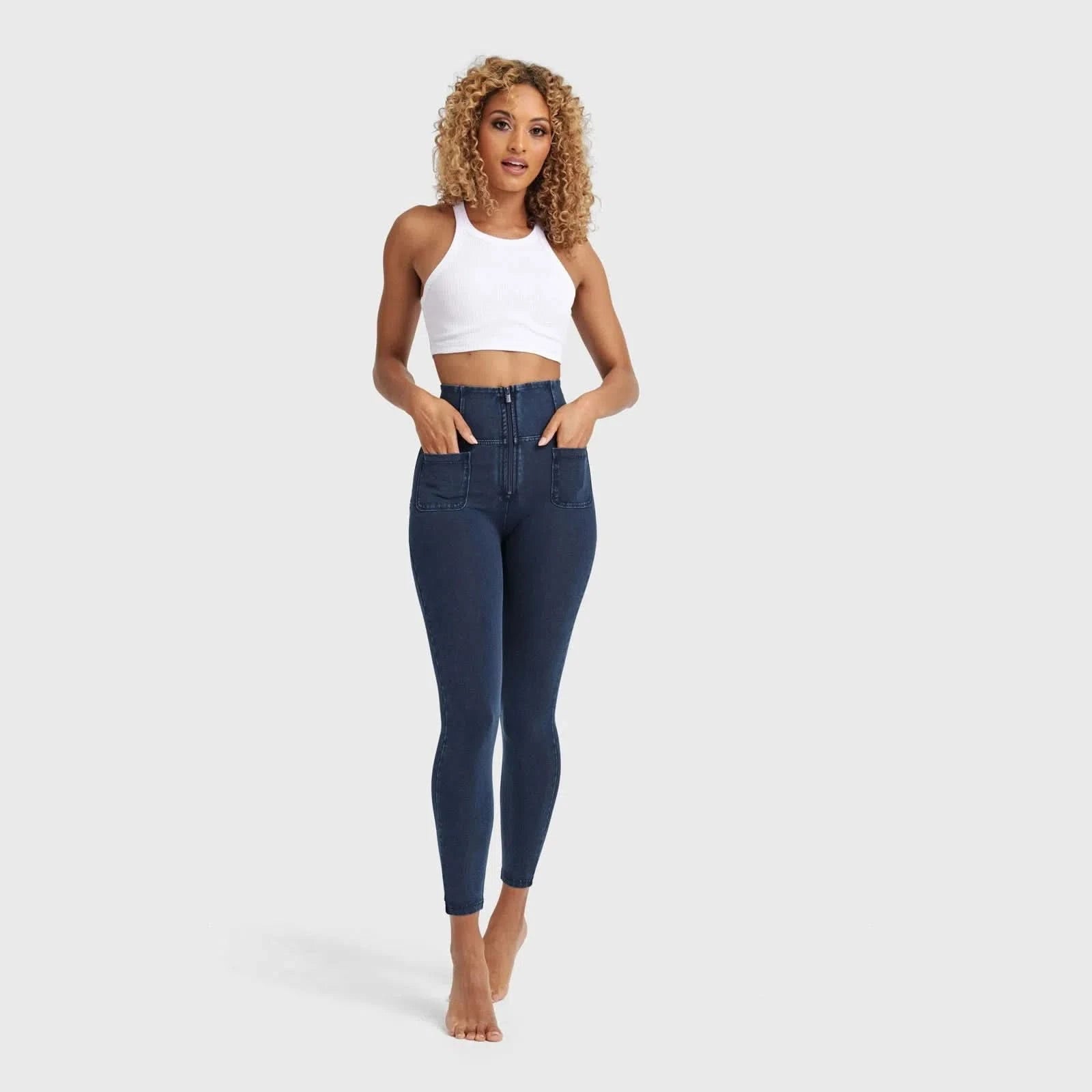 WRUP Denim With Front Pockets - Super High Waisted - 7/8 Length - Dark Blue + Blue Stitching
