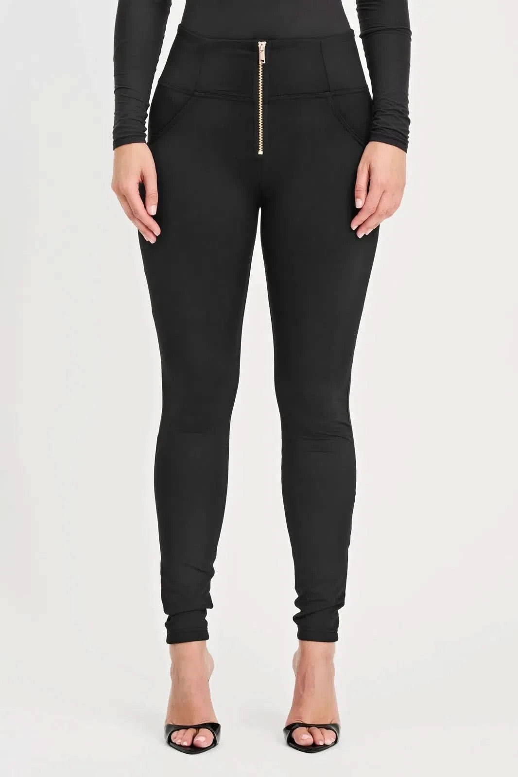 Stay warm and stylish with our new full-length, black fleece-lined pants, designed for ultimate comfort and style for those brisk days. Made from a stretch polyester, these pants move with you, offering a cozy, body-hugging fit thanks to Freddy's signature WRUP patent technology. The luxurious fleece lining provides extra warmth, while the gold feature zip adds a touch of elegance—perfect for those chilly days when you want both comfort and sophistication in one sleek design.